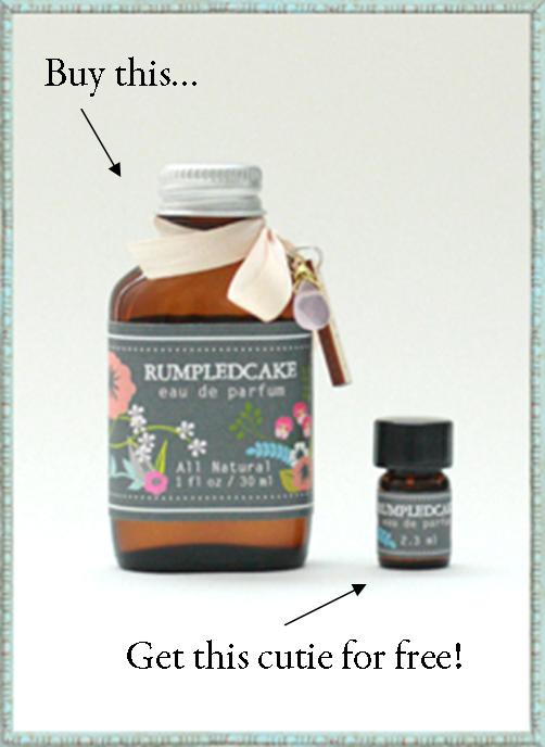 As a grand unveiling celebration, the first 20 orders of either the 15 ml or 30 ml size bottle of Rumpledcake eau de parfum will receive a complimentary travel size bottle ($12 value)! The orders have been coming in this morning so they are going fast! Once this batch is sold out.. it is sold out, but you'll be able to pre-order the September 2010 batch. :)