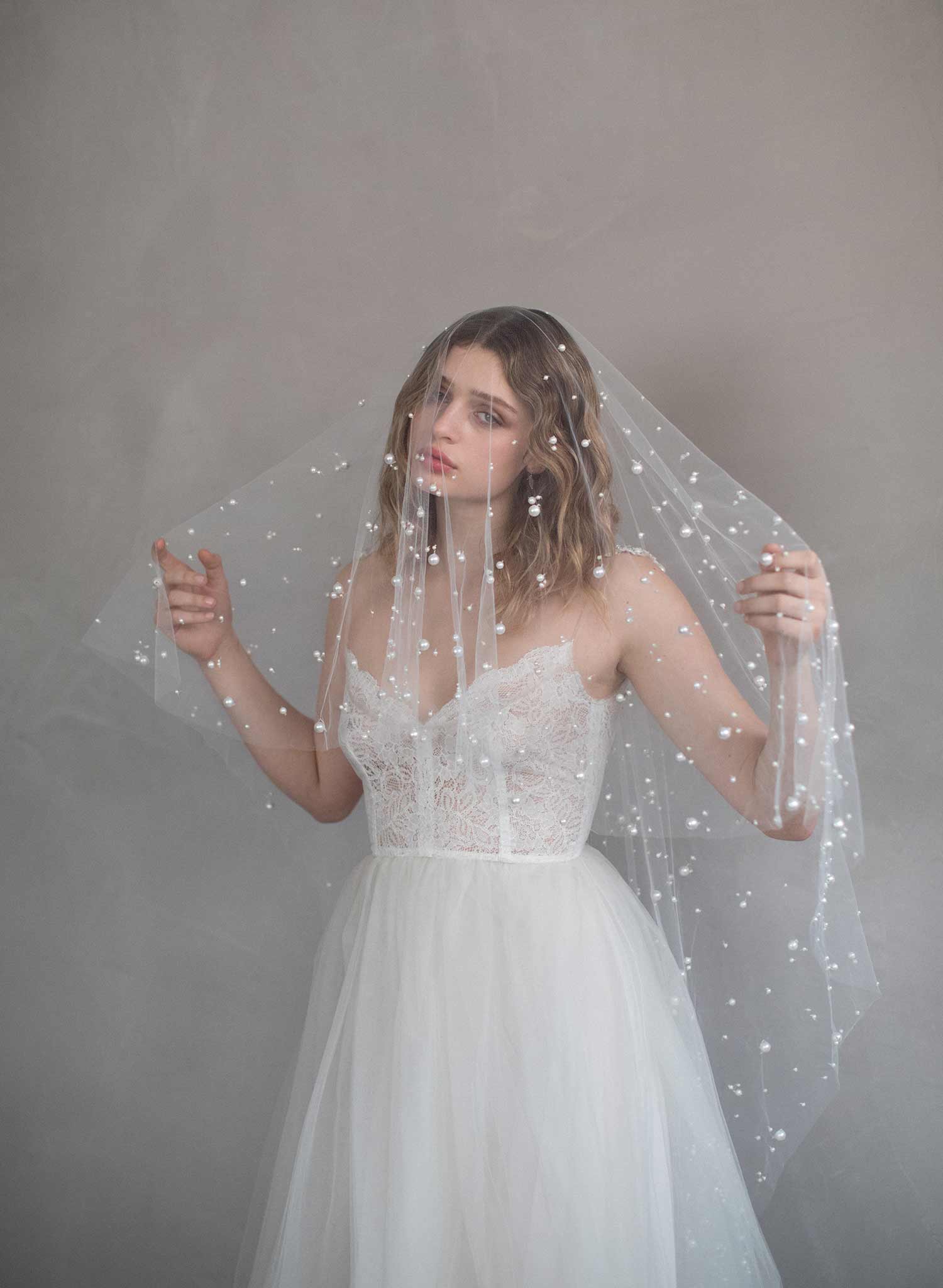 A romantic veil dripping with hundreds of hand sewn pearls, this veil is stunning and unique