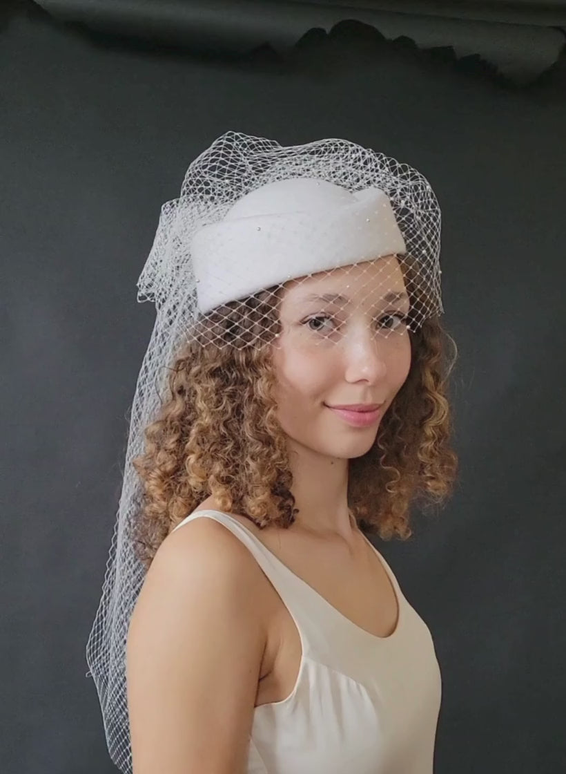 Bridal pillbox hat with pearl speckled veil - Style #2675